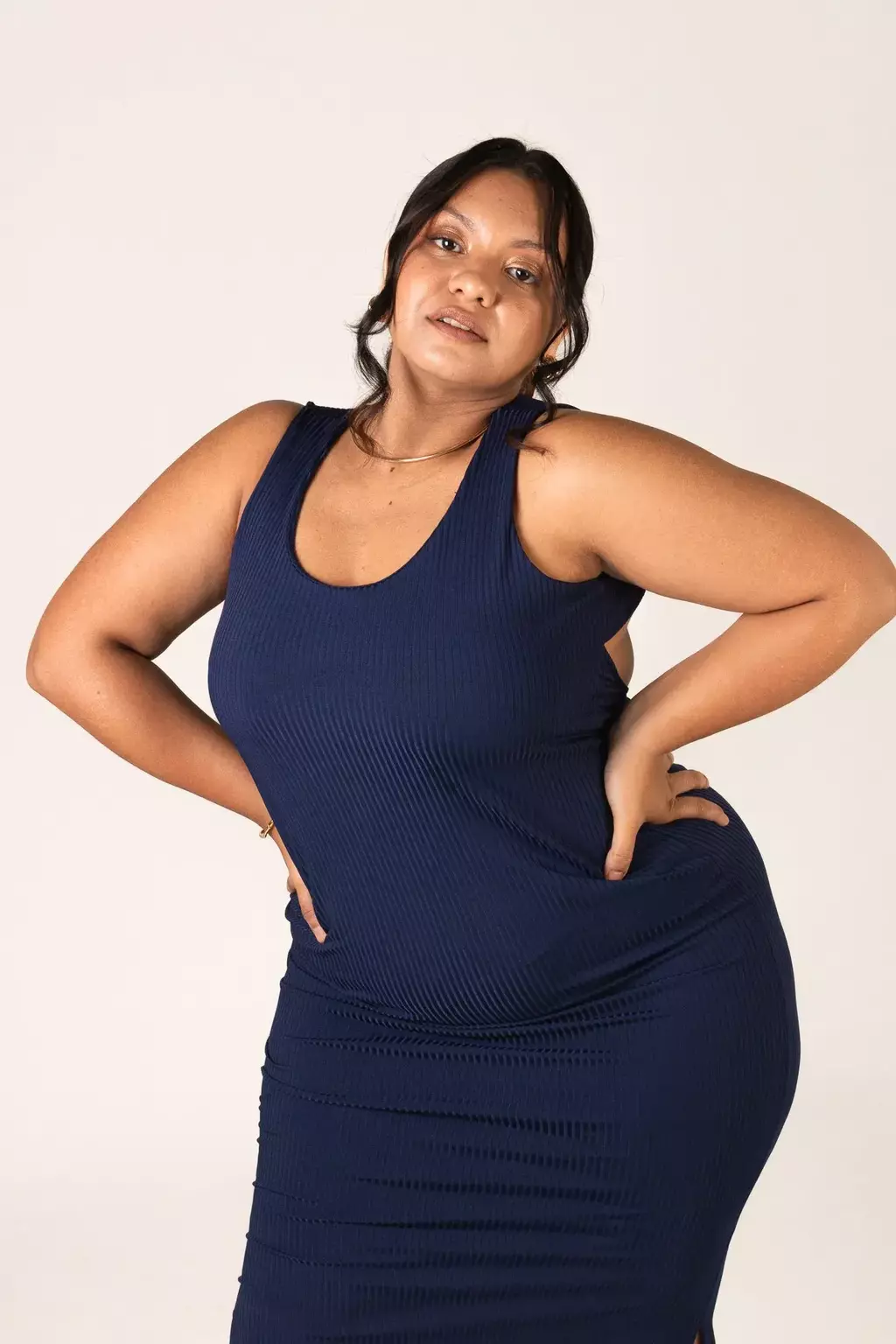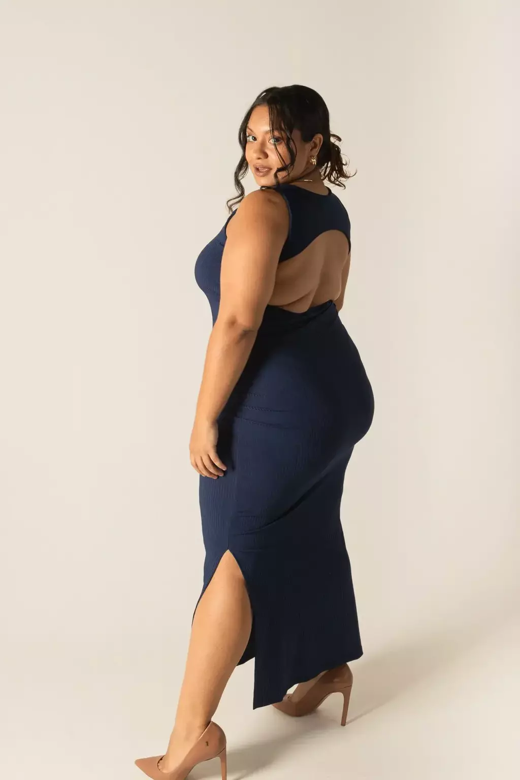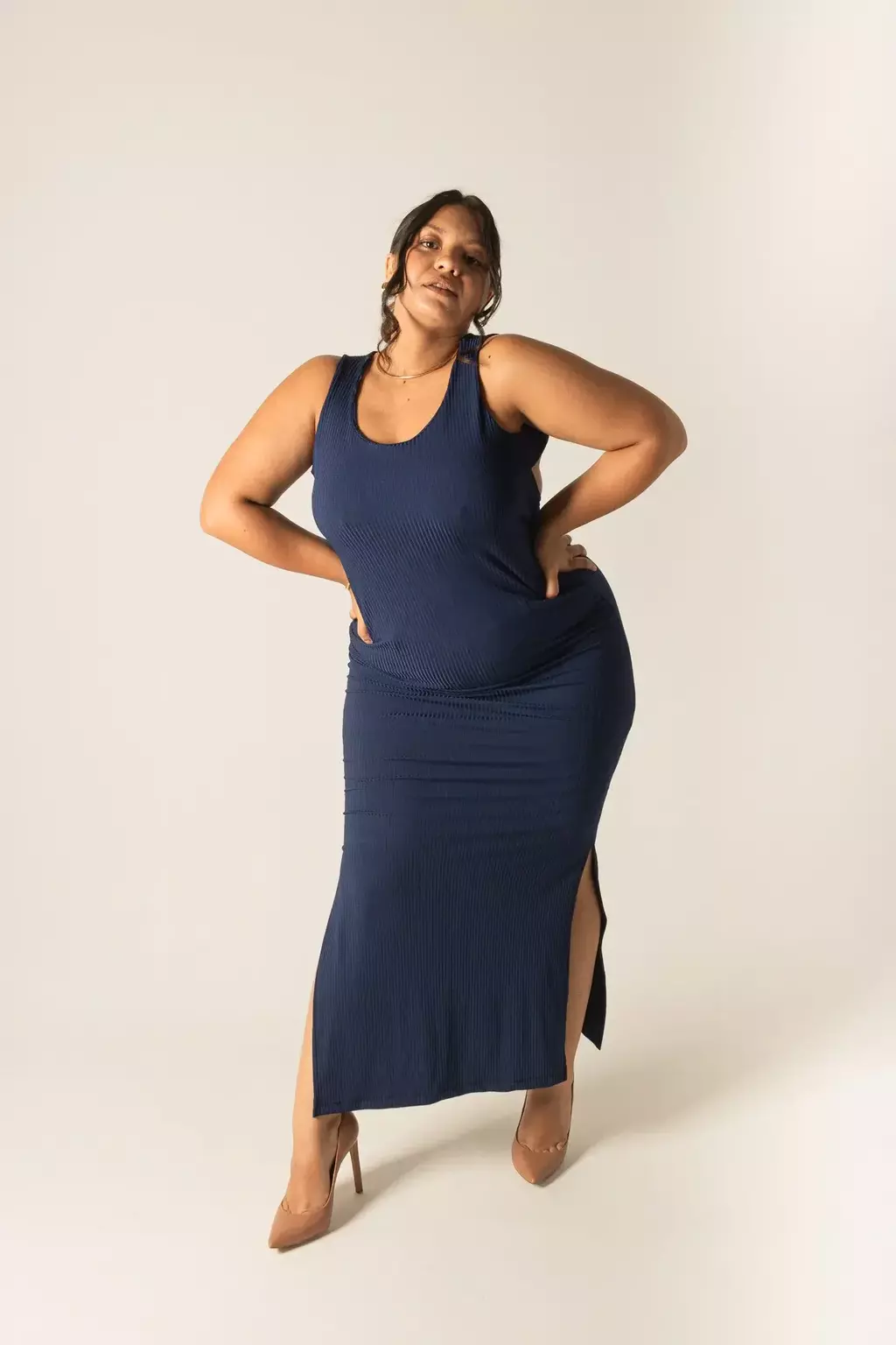 Vestido longo canelado, com meio forro duplo no busto para melhor sustentação, costas abertas e fendas em ambas laterais.